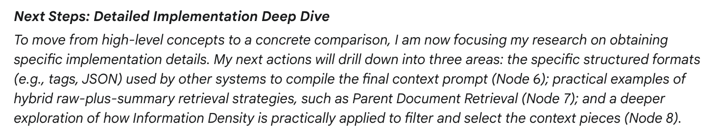 The planning task is well defined, simple, and gives us the ability to provide very specific reminders (more on the importance of reminders later). Once the plan is ready, it is the only context we bring into the research phase.