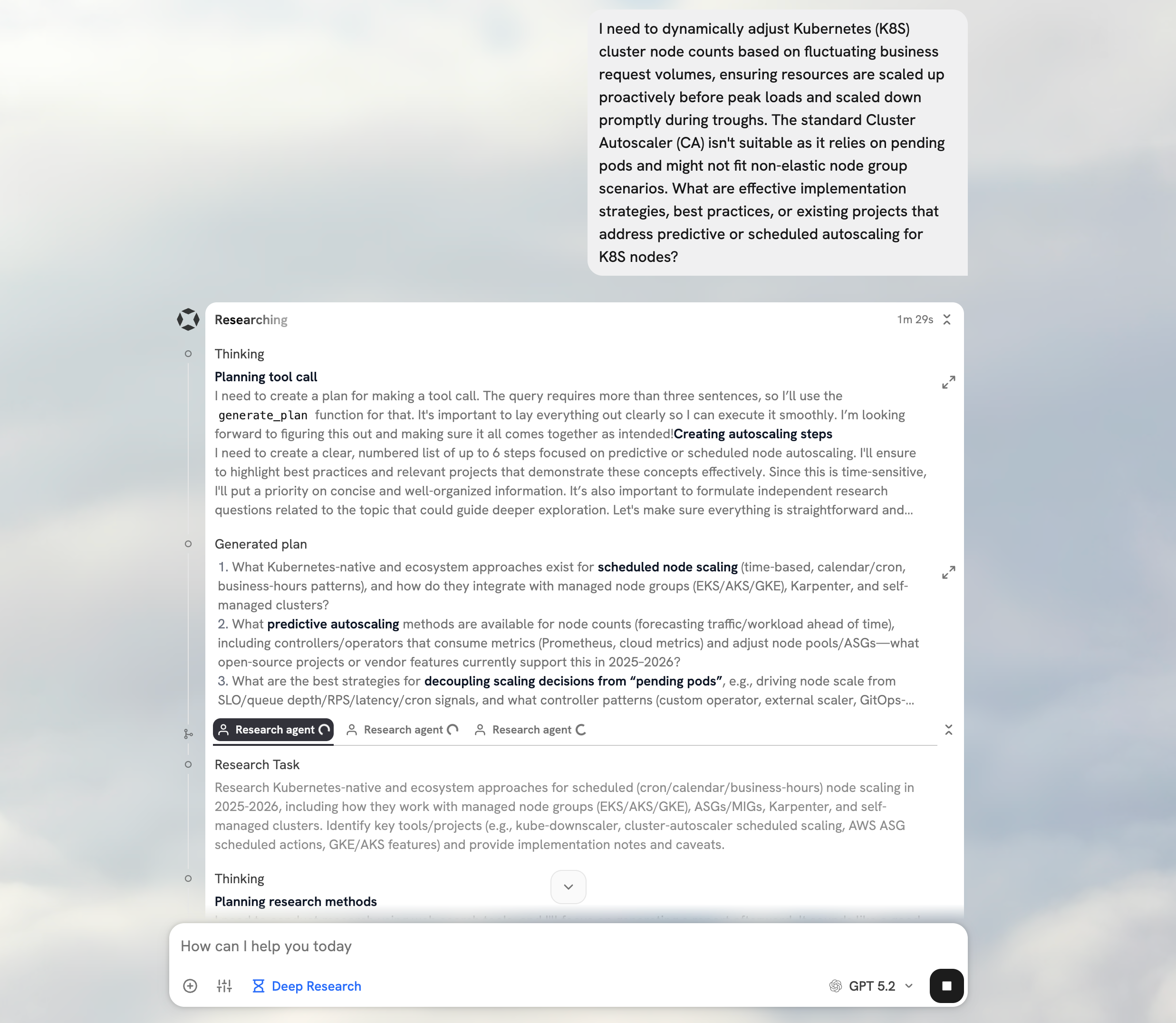For example, in our Deep Research, we start with a task of analyzing the user’s request and developing a comprehensive, high-level plan. This exercise is completely isolated from the actual execution of the research. We use a specific system prompt, curate the conversation history, and provide examples of plans that are thorough yet digestible by subagents with less high-level context.